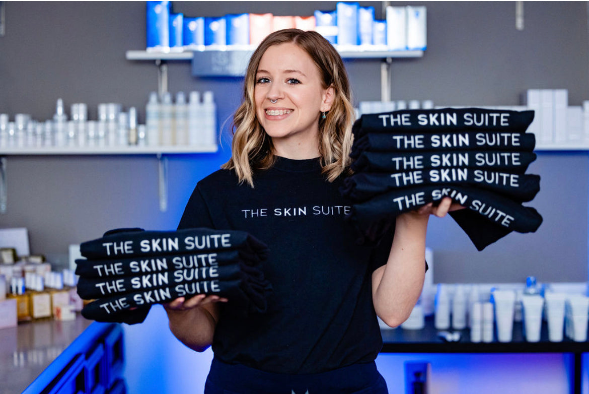 Comfort colors 100% cotton. Runs just slightly big - a relaxed fit - back is plain black front is black with white letters - “The Skin Suite” Natalie is wearing size small